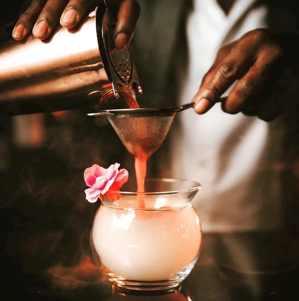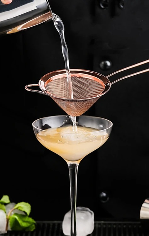COLADOR PARA COCTÉLES, DE COLOR ROSÉ. DE FORMA TRIANGULAR