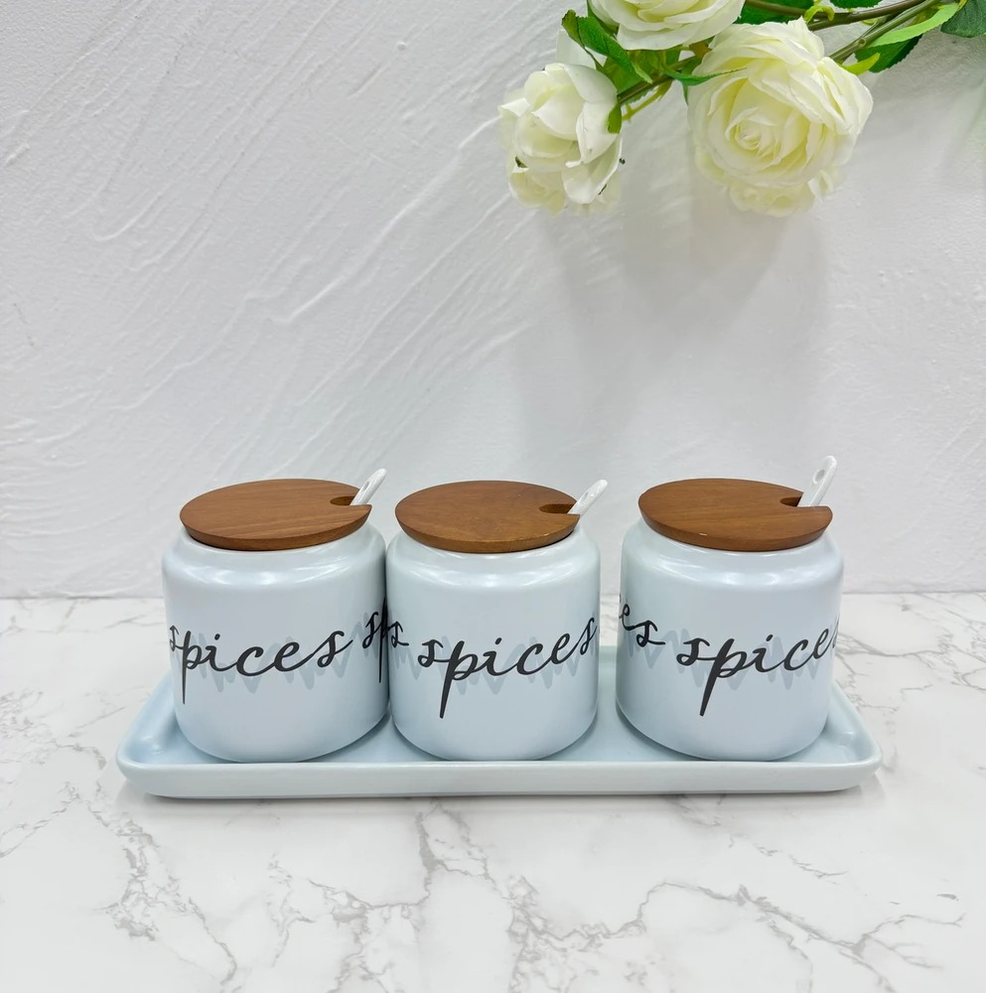 SET X 3 ESPECIEROS CERAMICA CON TAPA BAMBU +BANDEJA