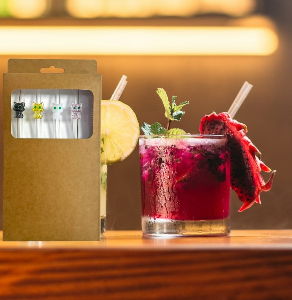 SORBETE DE VIDRIO CON GATOS DE COLORES X 4 +CEPILLO LIMPIA BOMBILLA