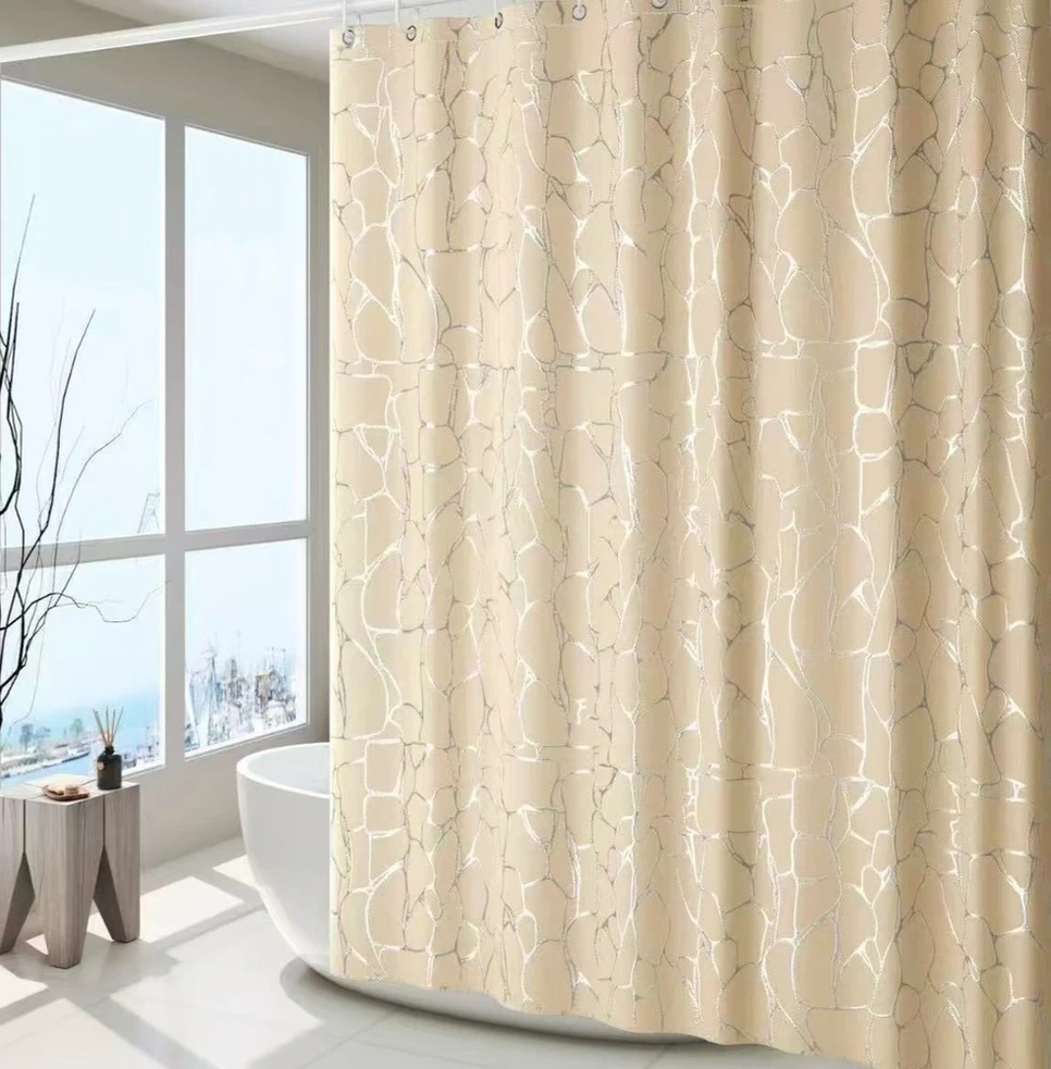 CORTINA BAÑO TELA TEFLON ANTIHONGO PIEDRAS BEIGE CON PLATA