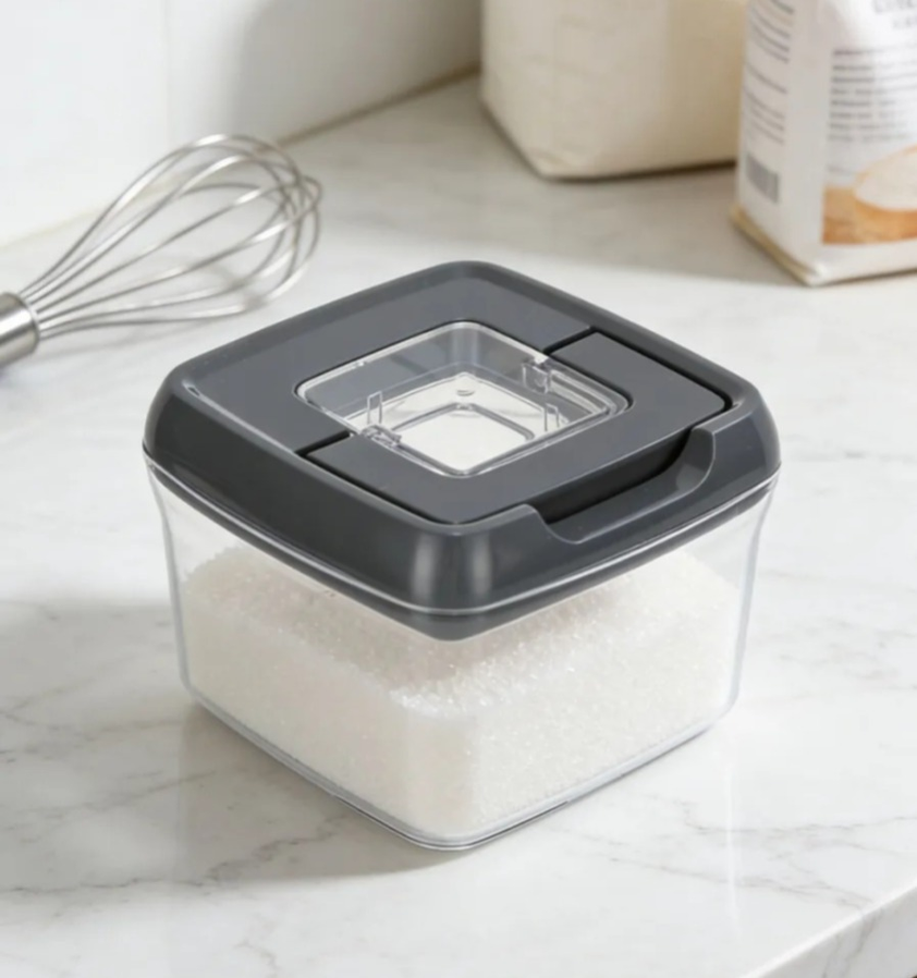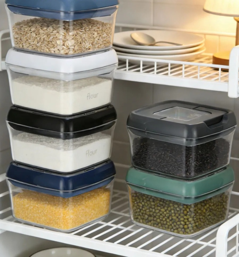 Contenedor de alimento hermético transparente con tapa y asa. Apilable, ideal para guardar snacks, frutas, granos o legumbres. Cierre hermético para conservar mejor los alimentos, perfecto para uso diario en la cocina.