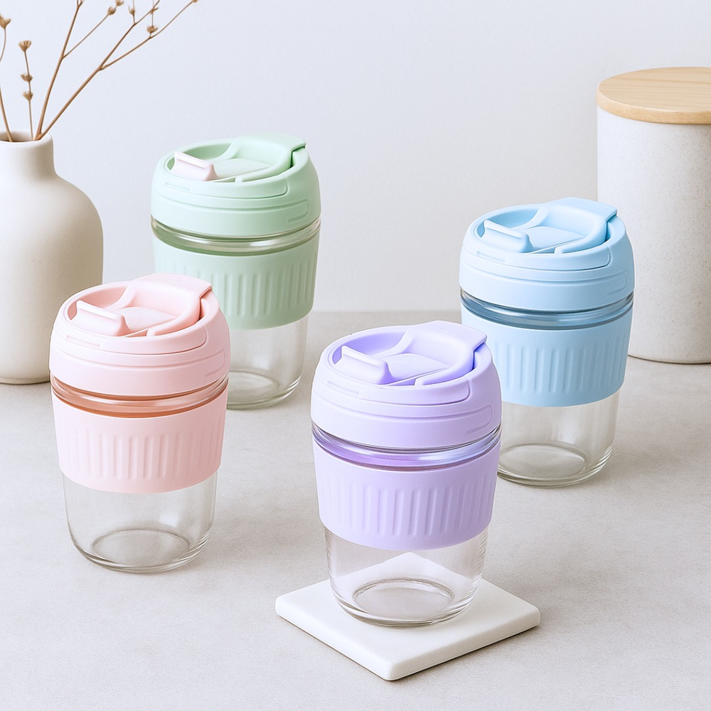 VASO DE VIDRIO CON BANDA Y TAPA DE SILICONA 390CC