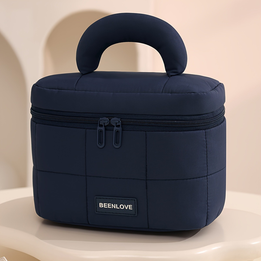 Organiza tus productos de belleza con este neceser portacosméticos acolchado. Ideal para viajes o uso diario, su diseño compacto y elegante facilita el transporte y cuidado de tus cosméticos.