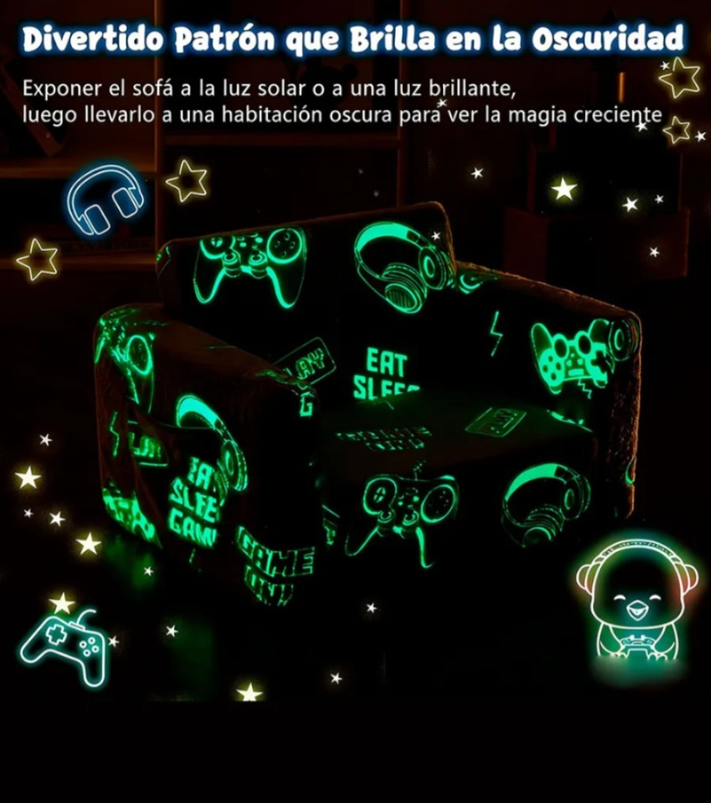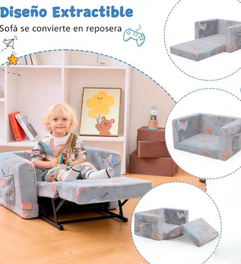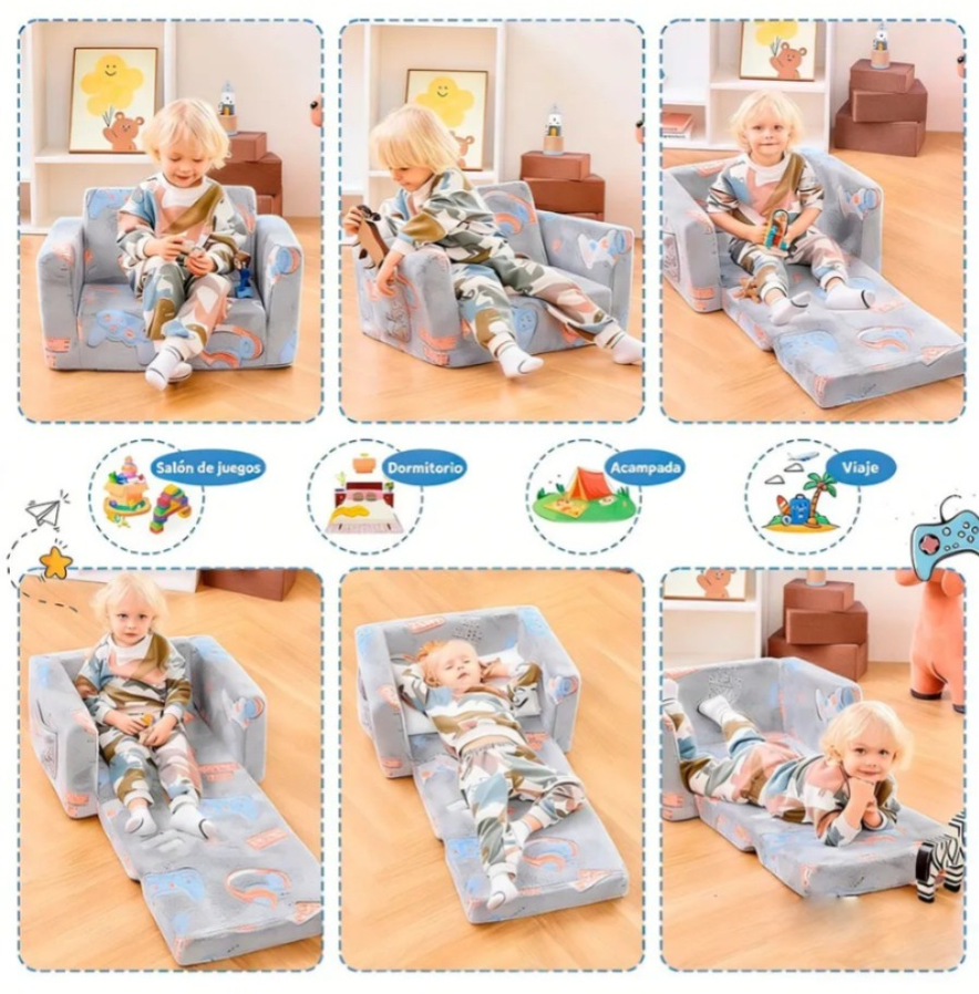 Sillón infantil, práctico y cómodo para el uso diario. Diseño 2 en 1 que se transforma fácilmente de sillón a cama plegable. Fabricado con tela suave y relleno de alta densidad que brinda buen soporte. La funda es removible y lavable, ideal para mantener la limpieza.