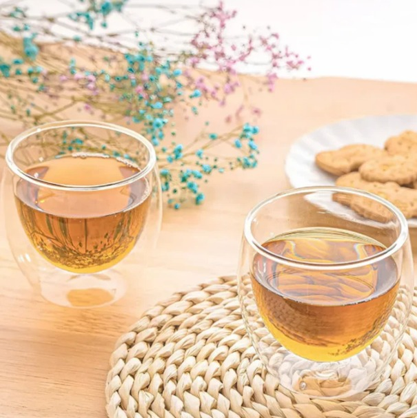 Set de 2 vasos de vidrio sin manija, con capacidad de 200 ml. Diseño moderno y minimalista, ideales para café, té o bebidas calientes.