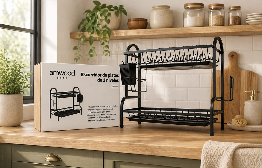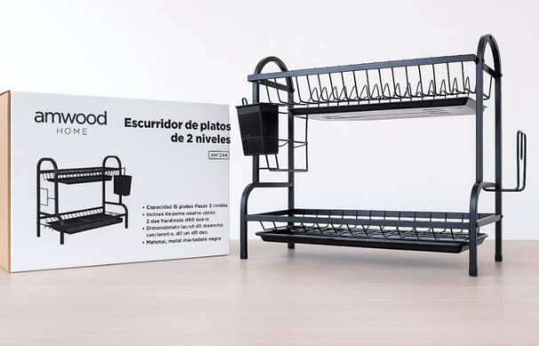 Escurridor de platos 2 niveles con 2 bandejas, capacidad 15 platos. Material: acero inoxidable negro. Medidas 53 x 25.5 x 41 -