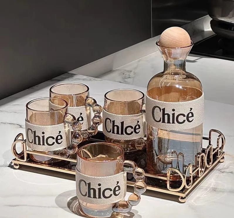 SET 7 PZAS BOTELLA + TAZAS ASA BURBUJA VIDRIO