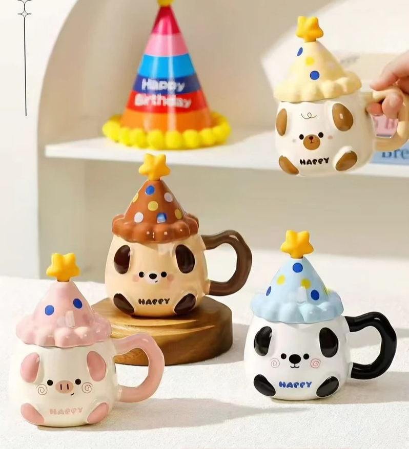 TAZA CERAMICA ANIMALES DE FIESTA BONETE CON TAPA