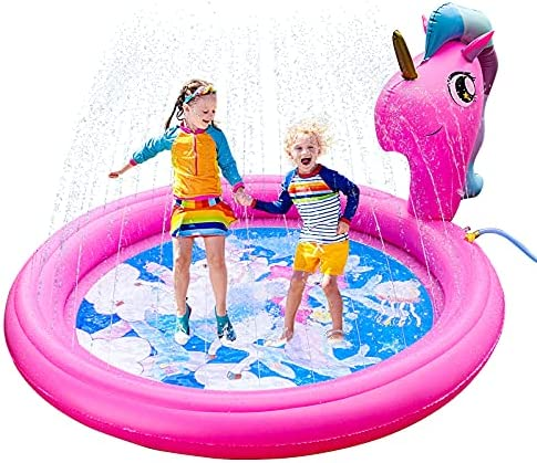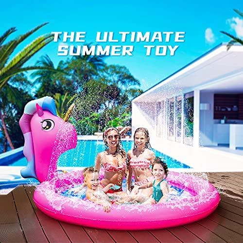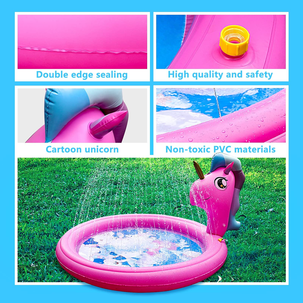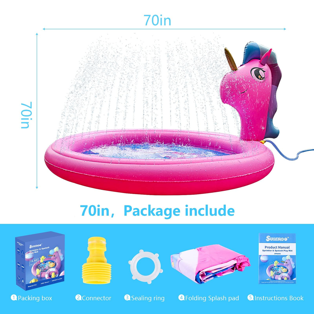 ALMOHADILLAS DE SUPER ROCIADORES DE 70 PULGADAS: LAS EXCLUSIVAS PLATAFORMAS DE CHAPOTEO Y ROCIADORES CON FORMA DE UNICORNIO DE 70 PULGADAS Y EL ESTILO DE PISCINA DE POCA PROFUNDIDAD ES PARA QUE TUS HIJOS SE MOJEN, CHAPOTEEN Y CREEN PRECIOSOS RECUERDOS CON SUS MASCOTAS, FAMILIARES Y AMIGOS EN EL CALUROSO VERANO. LA ALFOMBRA DE JUEGO PARA SALPICADURAS PERMITE QUE DE 2 A 4 NIÑOS SE MANTENGAN FELICES Y FRESCOS MIENTRAS DISFRUTAN DEL AIRE LIBRE.
