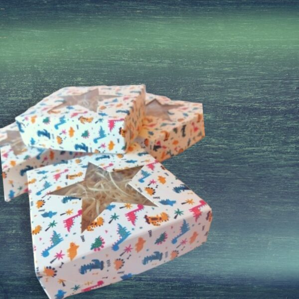 CAJA COOKIES DINNO, CARTULINA Y VISOR CALADO. MEDIDA 10,5×10,5×3 CM