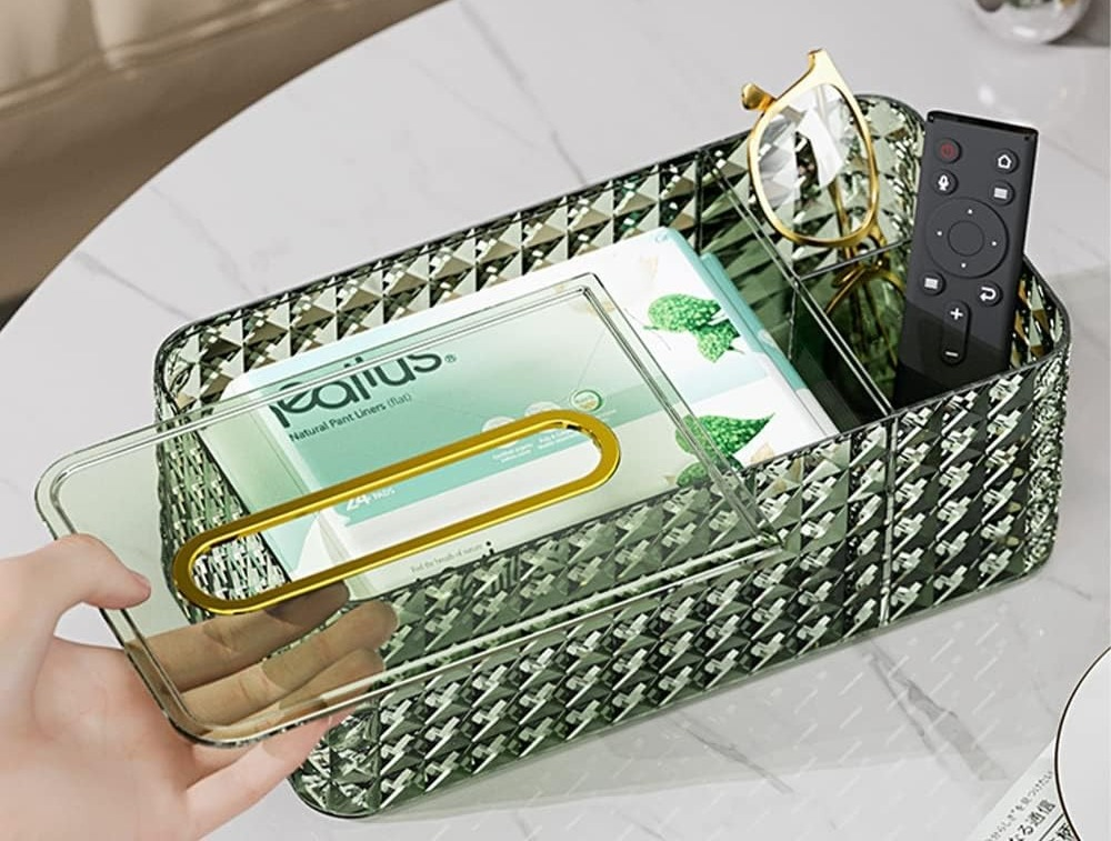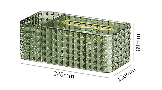 DESCRIPCIÓN: DISEÑADO CON UNA AMPLIA APERTURA, LA EXTRACCIÓN DE LA CAJA DE PAÑUELOS ES SUAVE SIN ATASCOS, LO QUE LE BRINDA UNA EXCELENTE EXPERIENCIA DE USUARIO. LA CAJA DE ALMACENAMIENTO ADOPTA UN DISEÑO DE REJILLA MÚLTIPLE, QUE SE PUEDE UTILIZAR NO SOLO PARA ALMACENAR PAÑUELOS, SINO TAMBIÉN PARA ALMACENAR CONTROL REMOTO, TELÉFONO MÓVIL Y OTROS ARTÍCULOS PEQUEÑOS. LA SERVILLETA ESTÁ HECHA DE MATERIAL PET DE ALTA CALIDAD. LA LONGITUD DE ESTE PRODUCTO ES DE 24CM, EL ANCHO ES DE 12CM Y LA ALTURA ES DE 9CM. ES ADECUADO PARA EL HOGAR, LA OFICINA, LA SALA DE ESTAR, EL DORMITORIO O LA ESCUELA, ETC.