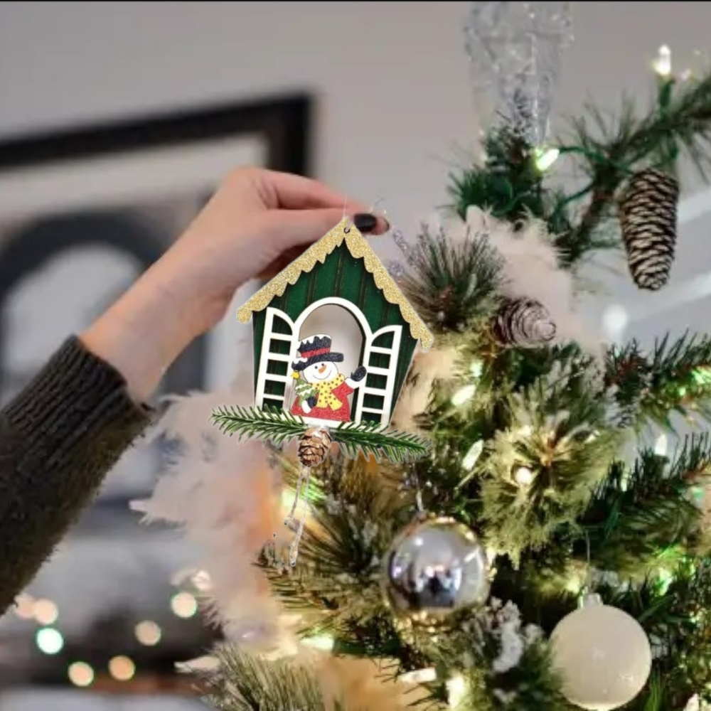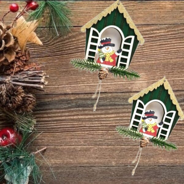 ADORNO CASITA VERDE VENTANADE MADERA MUÑECO NIEVE PREMIUM