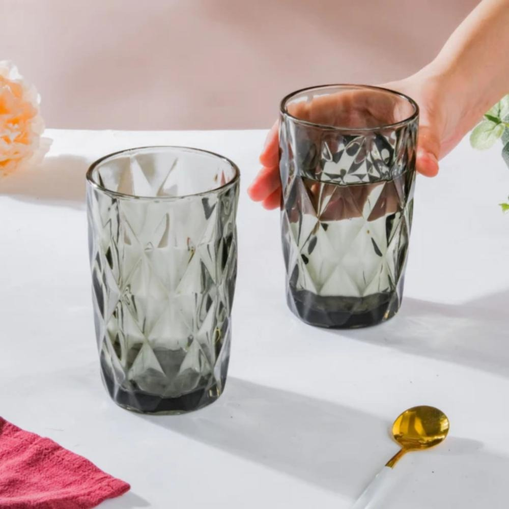 VASOS DE VIDRIO LABRADO. INCLUYE 6 UNIDADES, IDEAL PARA LUCIR EN TU MESA.