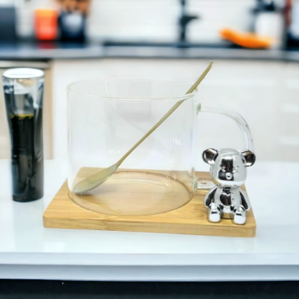 SET DE TAZA DE VIDRIO, DE ALTO 7CM Y DE ANCHO 8CM. VIENE CON UN POSAVASOS CON UN OSITO. Y VIENE CON UNA CUCHARITA DORADA