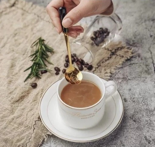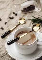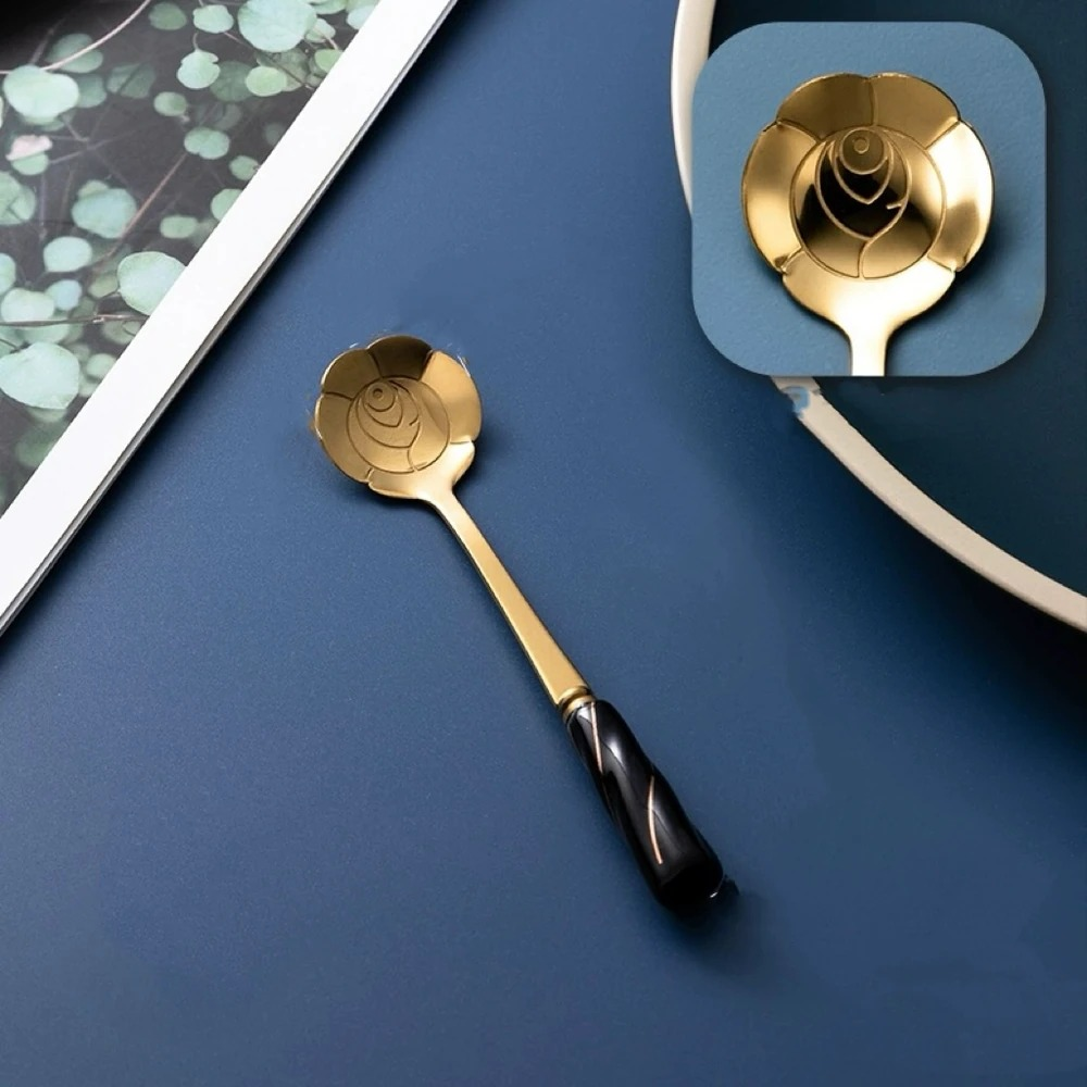 CUCHARA DORADA CON DISEÑO DE ROSA, CON MANGO NEGRO COB LINEAS DE BRONZE. PARA CAFE, TE, POSTRES. DE EXCELENTE CALIDAD