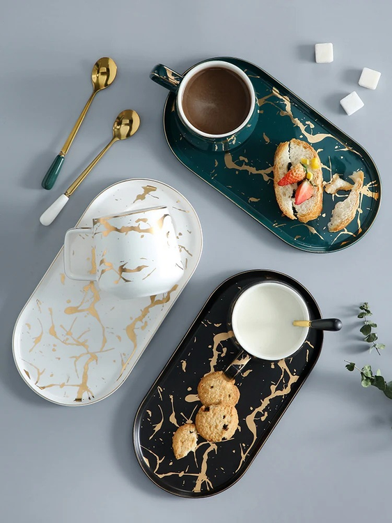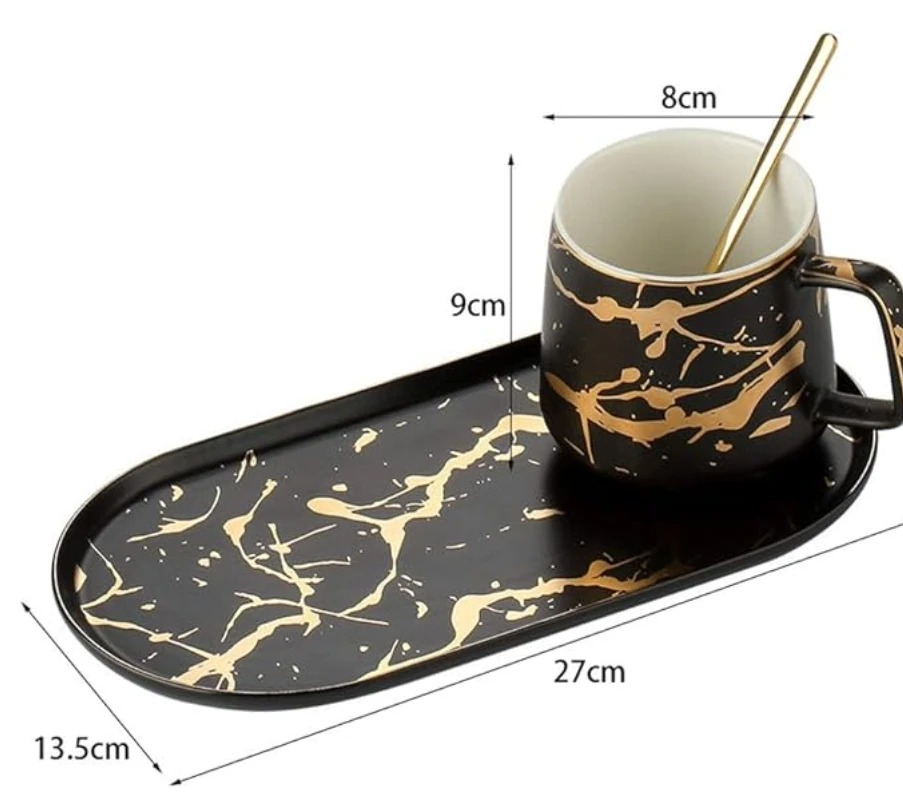 TAZA CON BANDEJA DE CERAMICA CON LINEAS DORADAS Y CUCHARA DORADA