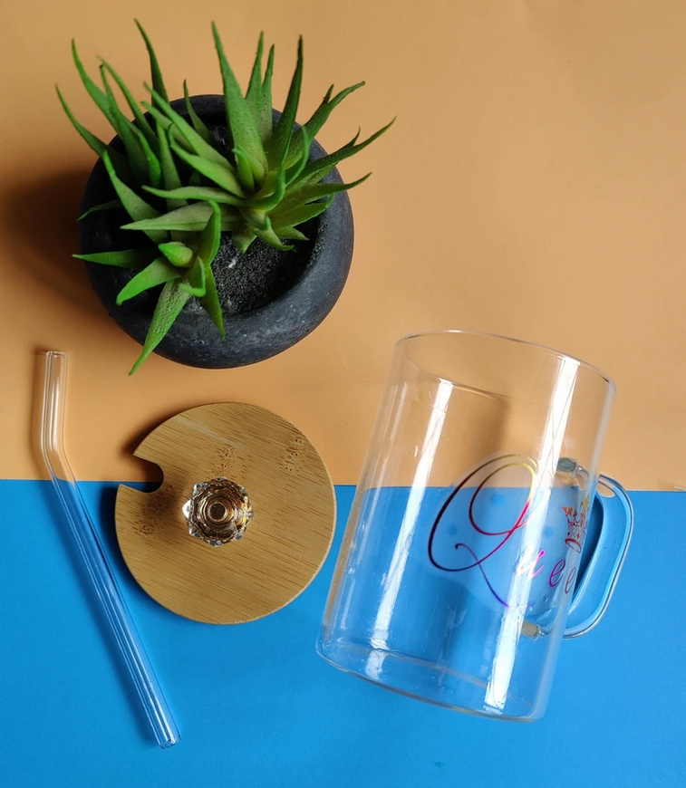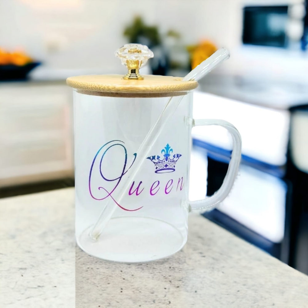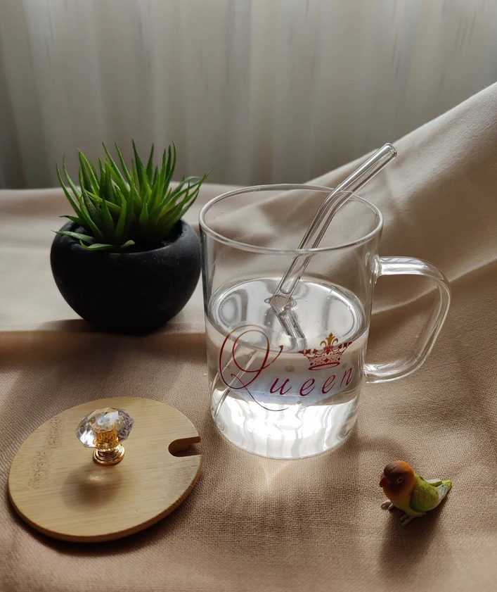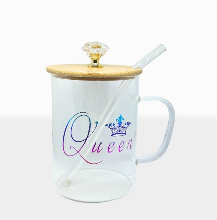TAZA DE VIDRIO CON DISEÑO DE LETRAS, DE ALTO 11CM Y DE ANCHO 8CM. VIENE CON TAPA Y SORBETE
