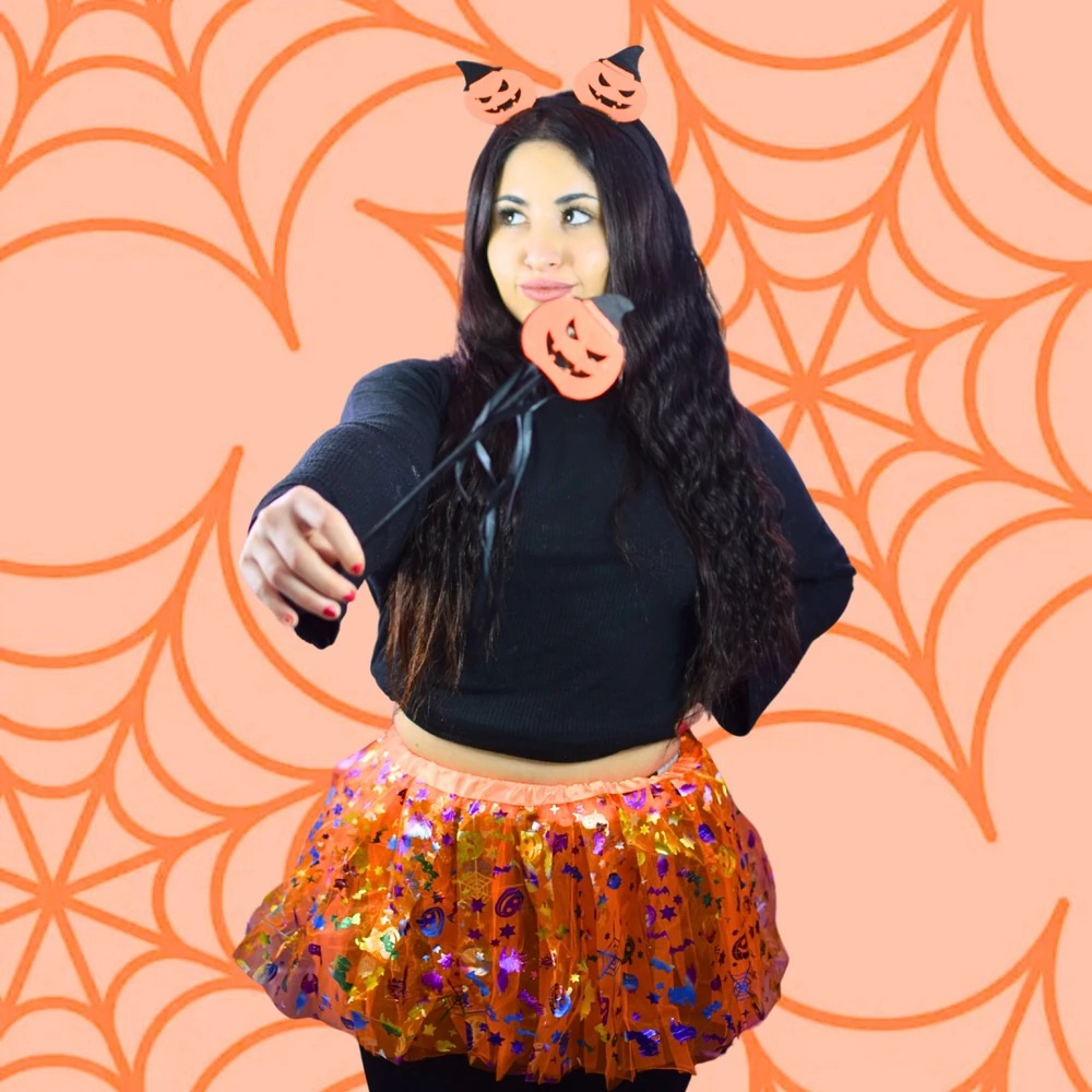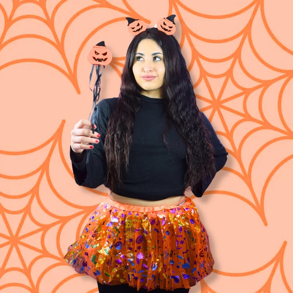 DISFRAZ DE HALLOWEEN CON VINCHA DE CALABAZAS, VARITA Y POLLERITA TUTÚ ESTAMPADA