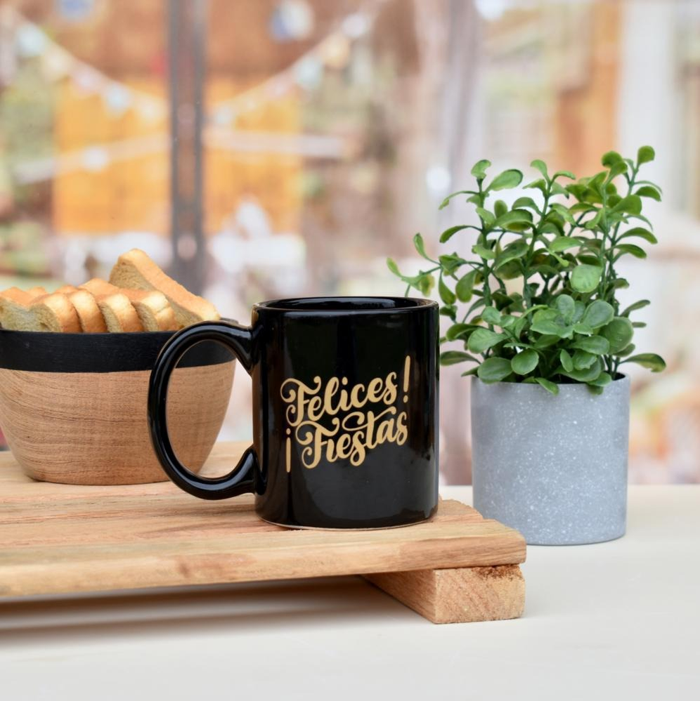 TAZA RECTA DE CERÁMICA CON MANIJA, ESTAMPADA CON SERIGRAFÍA DORADA