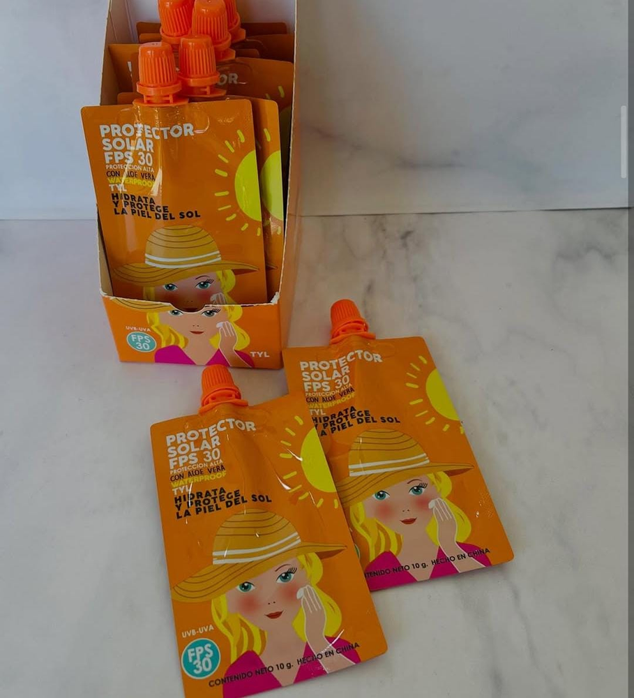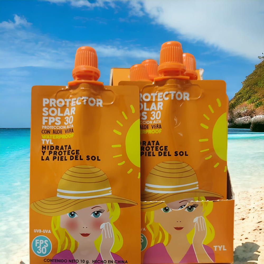SOBRE PROTECTOR SOLAR FPS 30 C/ALOE VERA WATWRPROOF TYL HIDRATA Y PROTEGE LA PIEL DEL SOL CONTENIDO NETO 10GR